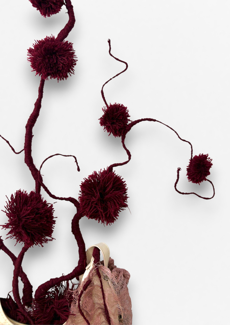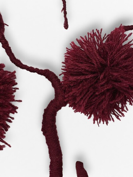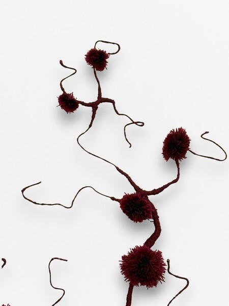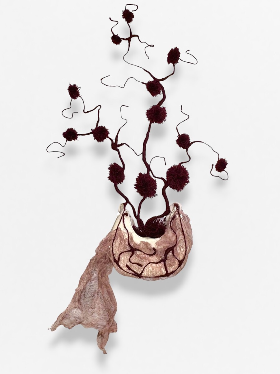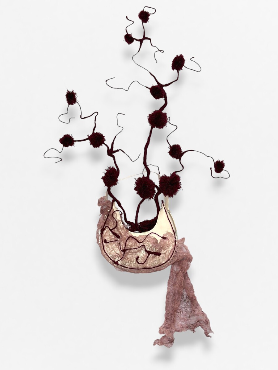 Обыденный, безопасный предмет вступает в контраст с тем, что скрыто внутри: проволочные «сосуды», обмотанные красной нитью, и марля, напоминающая ткани, формируют образ живой, пульсирующей материи.