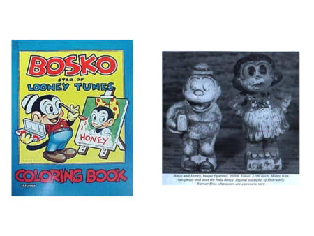 (A) The character Bosko. Warner Bros., Looney Tunes series, c. 1930. (B) Bosco Coloring Book, 1950 and Bosco and Honet figurines, 1930