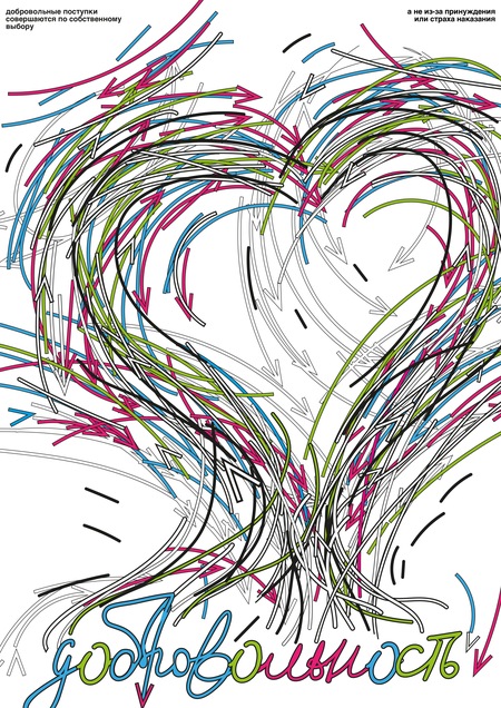 Смысл плаката заключается в том, что добровольность=действия. Что-то может иметь смысл, а что-то нет, главное, чтобы от чистого сердца. Таким образом, от буквальной добровольности (слова) исходит ряд стрелочек (действий, выполненных от чистого сердца), которые легко теряются в потоке чужих проявлений разного характера: и хороших, и плохих. Но тем не менее, в итоге все приходит к одному — к сердцу.