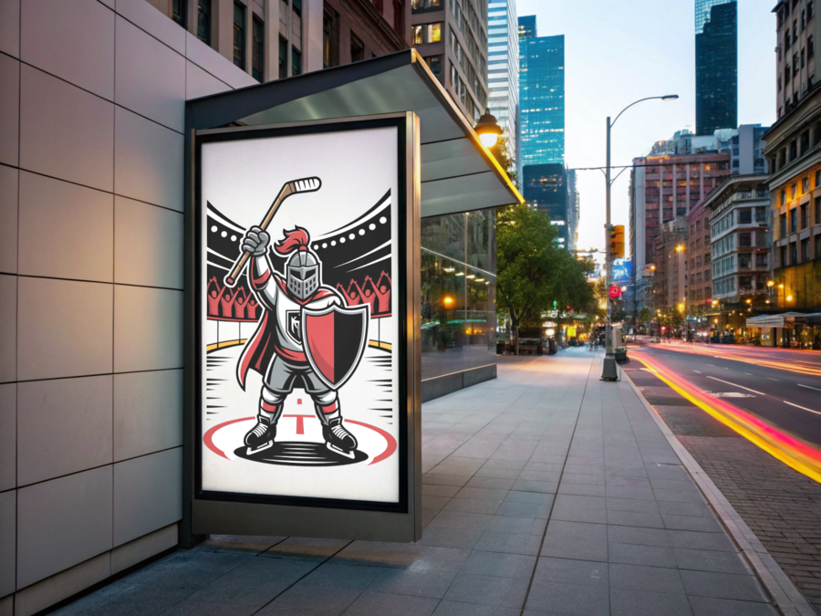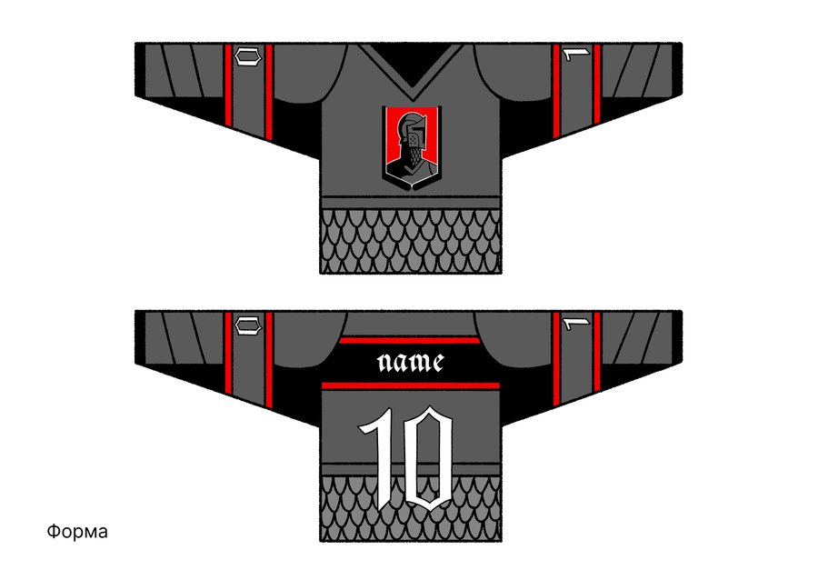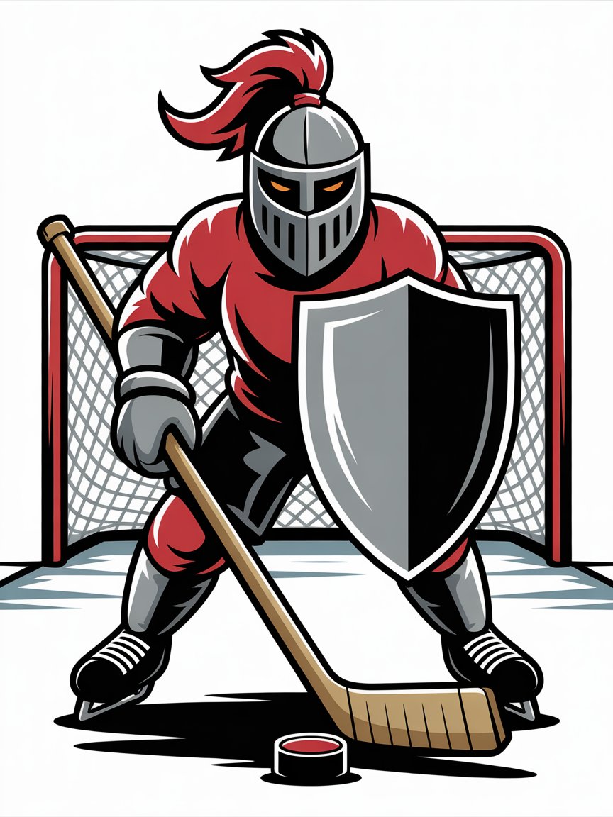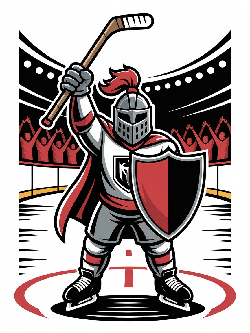 Запрос для генерации промта: придумай промт для иллюстрации, связанной с хоккейным клубом, чьим маскотом является рыцарь. основные цвета — красный, черный и серый.