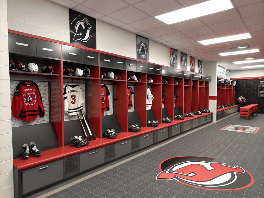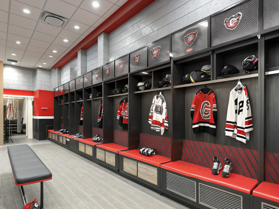 Промт для генерации раздевалки: Create a detailed image of a hockey team locker room for a club. The design should feature modern lockers, benches, and hockey equipment. Use a color palette of red, black, and gray, with sleek and industrial styling. The locker room should look energetic, professional, and inviting for players, with a clean and organized layout.