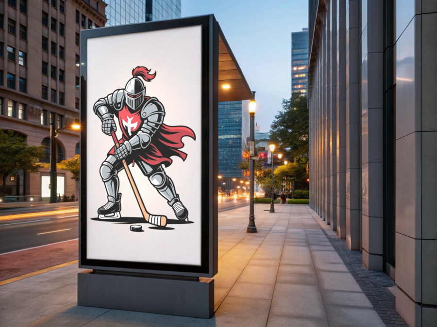 Промт для генерации иллюстраций: Create an illustration featuring a heroic knight mascot for a hockey club. The knight should be dressed in armor with a commanding and fierce stance, holding a hockey stick. Incorporate dynamic motion and a powerful presence. Use a color palette of red, black, and gray, with bold lines and detailed armor design. The scene should evoke strength, courage, and team spirit.