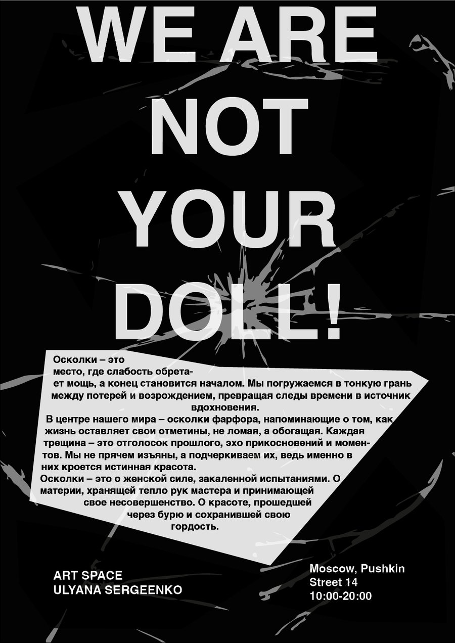 Проект «WE ARE NOT YOUR DOLL» формулирует свой визуальный и социальный манифест и выстраивает серию плакатов и айдентичных носителей, обращнных к теме объективации и навязанных ролей. Проект исследует, как тело, образ и идентичность превращаются в объект потребления, контроля и ожиданий, и противопоставляет этому прямое, жёсткое высказывание — отказ быть «куклой».