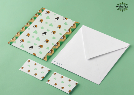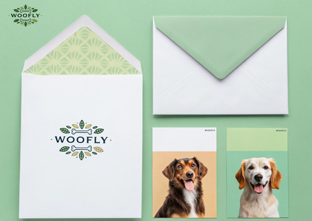 Generate a mockup of printed materials (paper, envelope, business cards) for the WOOFLY food supplements for dogs inspired by tails of different dogs On a pale green background, using the colours B9D397 and F0E4C9 as the main colours. нейросеть: recraft.a Логотипы добавлены в Figma