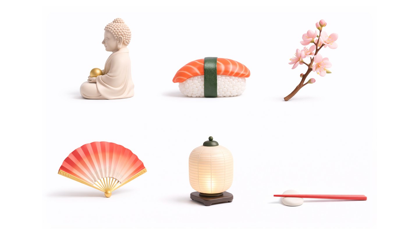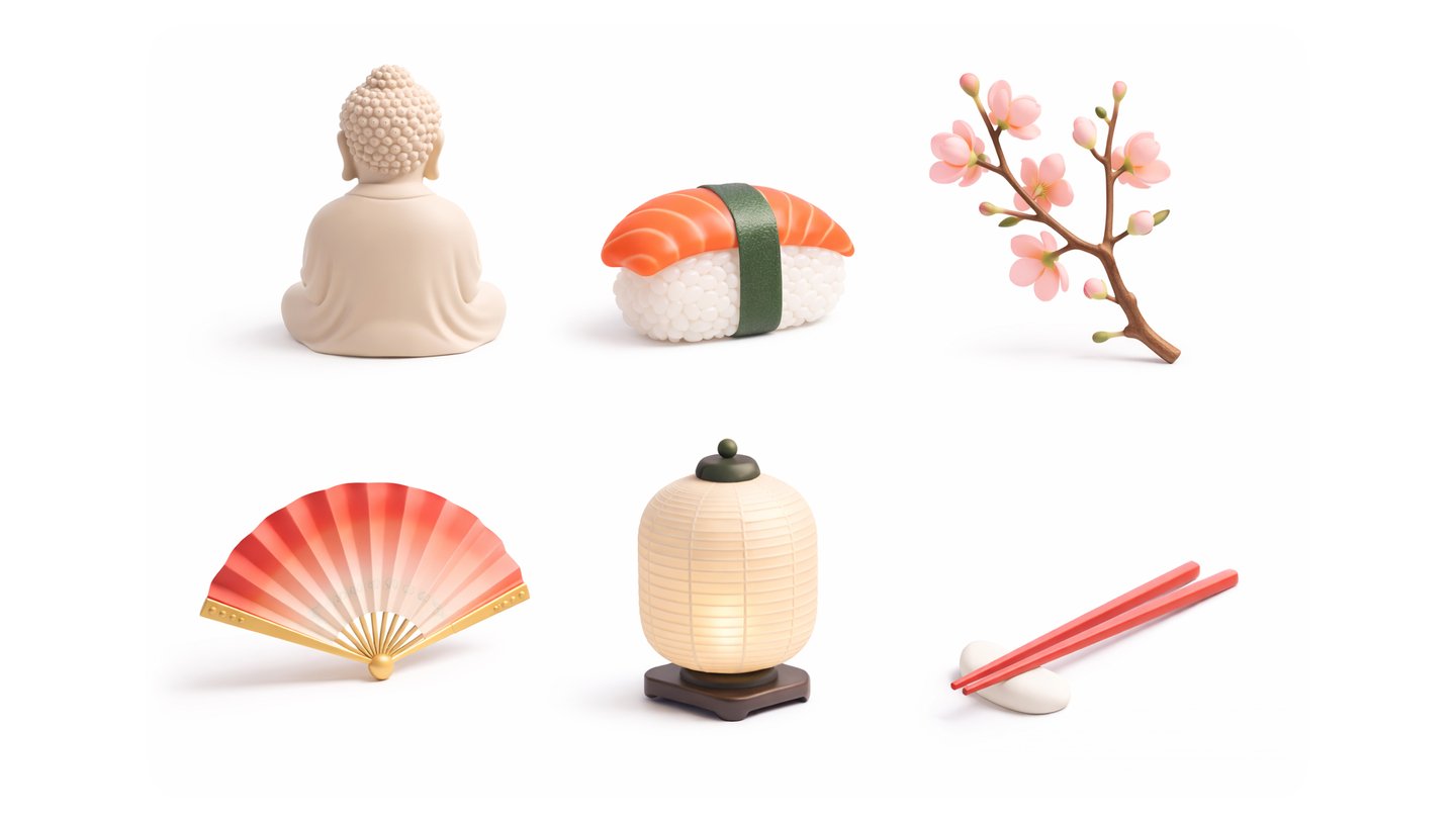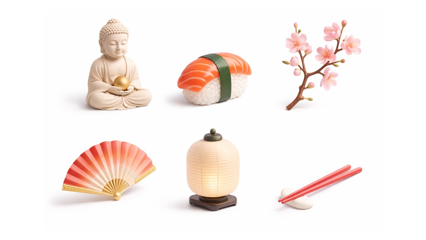 промпт: набор минималистичных миниатюр на основе референсного стиля (будда, японский фонарь, палочки для суши, веер, ветка сакуры, суши). минималистичные 3d модели на белом фоне