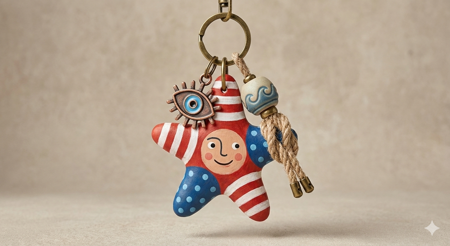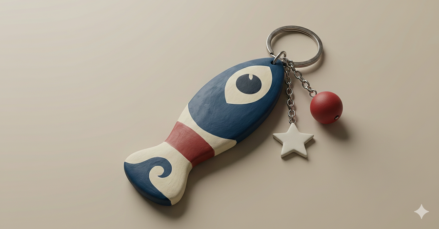 Центральный элемент (рыбка) — основной фокус, остальные подвески (звезда, бусина) — асимметрично расположены