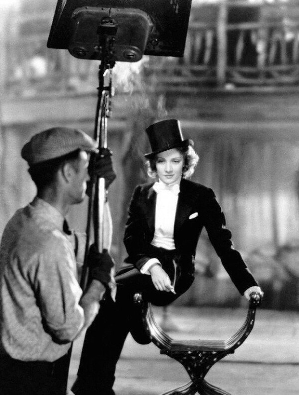 Настоящий фурор произвел фильм Йозефа фон Штернберга «Марокко» 1930-го года, в котором Марлен в одном из самых значимых эпизодов киноистории выходит на сцену кабаре полностью в мужском образе: мужском фраке, цилиндре и галстуке-бабочке.