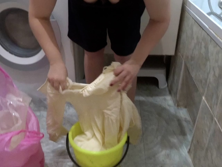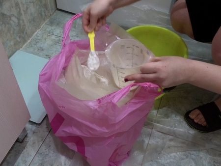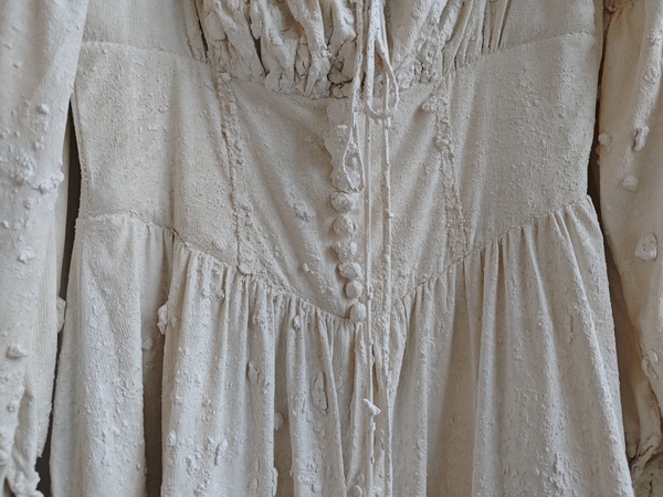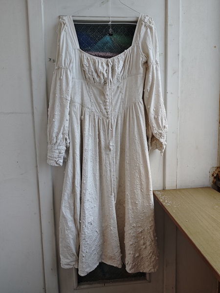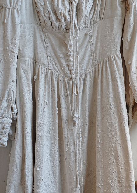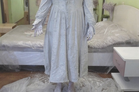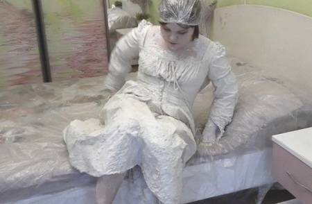Кремовое платье окунается в раствор гипса, а затем я его надеваю, и оно застывает прямо на теле. Это попытка «запечатать» себя в этой мнимой красоте, которой должны следовать девушки. Я гиперболизирую эту необходимость, стараясь сохранить этот образ и слиться с ним. Пусть я буду навечно в этом платье, и оно никогда не пропадет с моего тела, ведь я хочу всегда быть «красивой» и «утонченной». Эти модели поведения навязаны обществом…