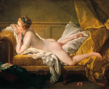 Другими характерными примерами являются многочисленные ню Буше. Художник не раз писал обнаженных моделей в явно интимной обстановке. Его известные полотна «Отдыхающих девушек» изображают юную обнаженную особу, лежащую на животе на диване и беззаботно улыбающуюся зрителю.