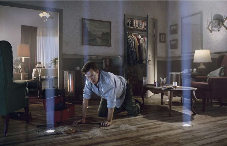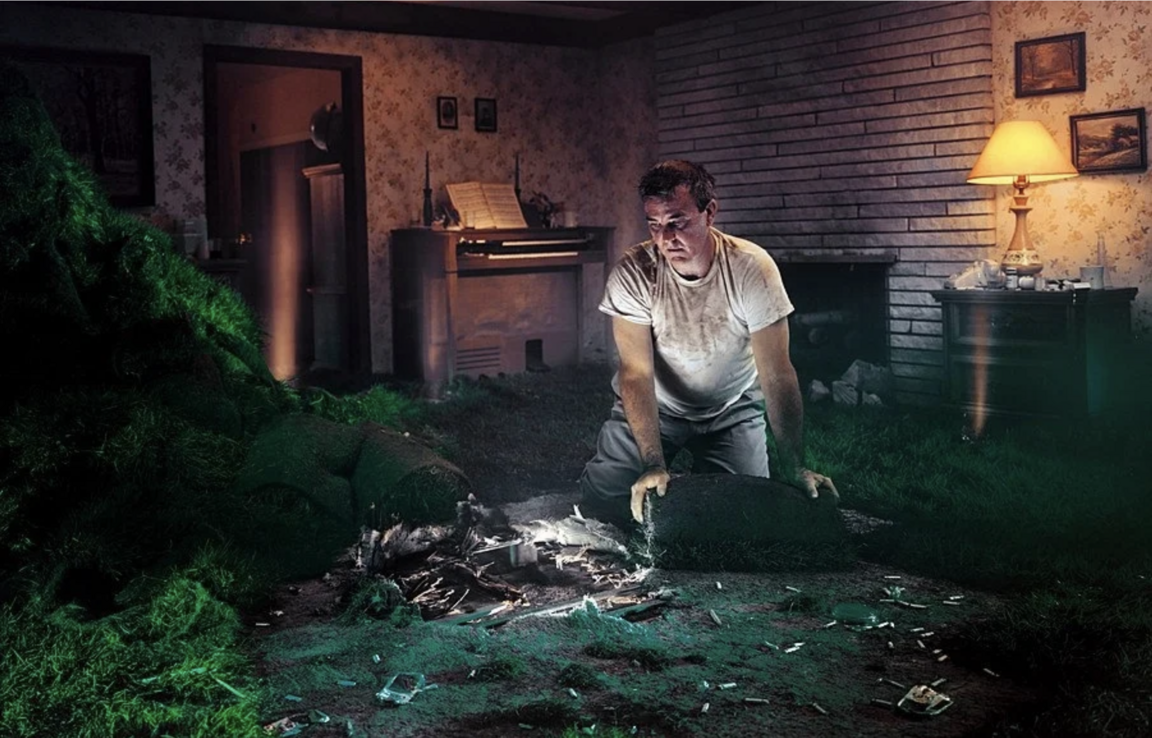 Если Джефф Уолл ведет диалог с музеем, то Грегори Крюдсон создает целый кинотеатр подсознания. Его работы — это тотальные художественные миры, где стратегия Tableau Vivant достигает своей максимальной, почти фанатичной реализации. Крюдсон не просто инсценирует реальность, он строит её с нуля, превращая фотографию в форму визуальной психоаналитической драмы. Его сцены, погруженные в сумеречный свет, исследуют коллективные тревоги, скрытые страхи и сюрреализм, таящийся под тонким слоем американской провинциальной идиллии.