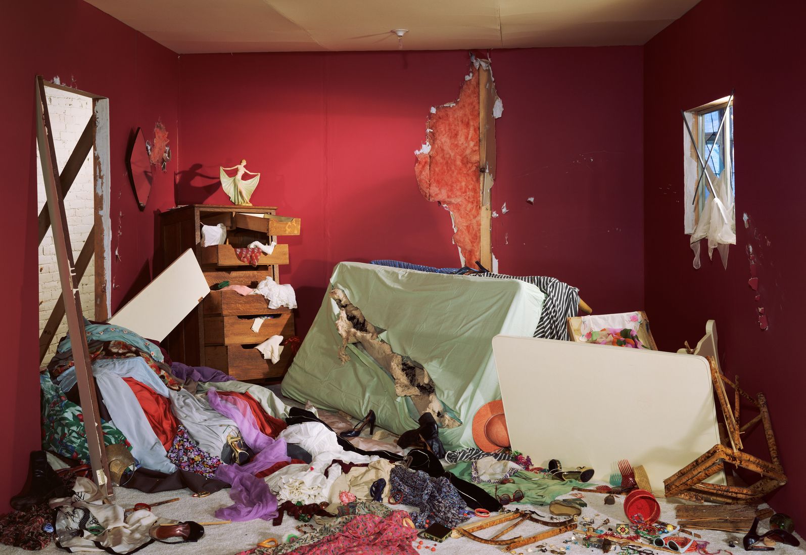 Феномен «выверенной катастрофы» находит свое программное воплощение в работе Джеффа Уолла «The Destroyed Room» (1978). Эта работа, ставшая его первым обращением к форме постановочной фотографии, представляет собой тщательно срежиссированный хаос, где насилие над пространством обретает качества театрального действа.