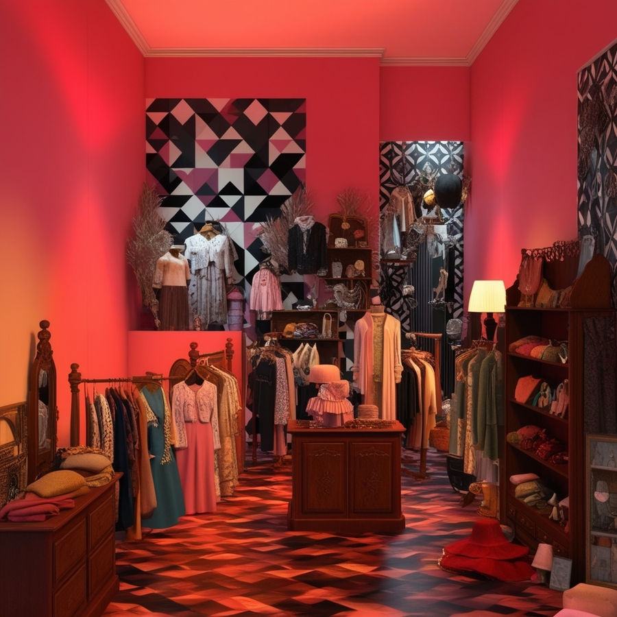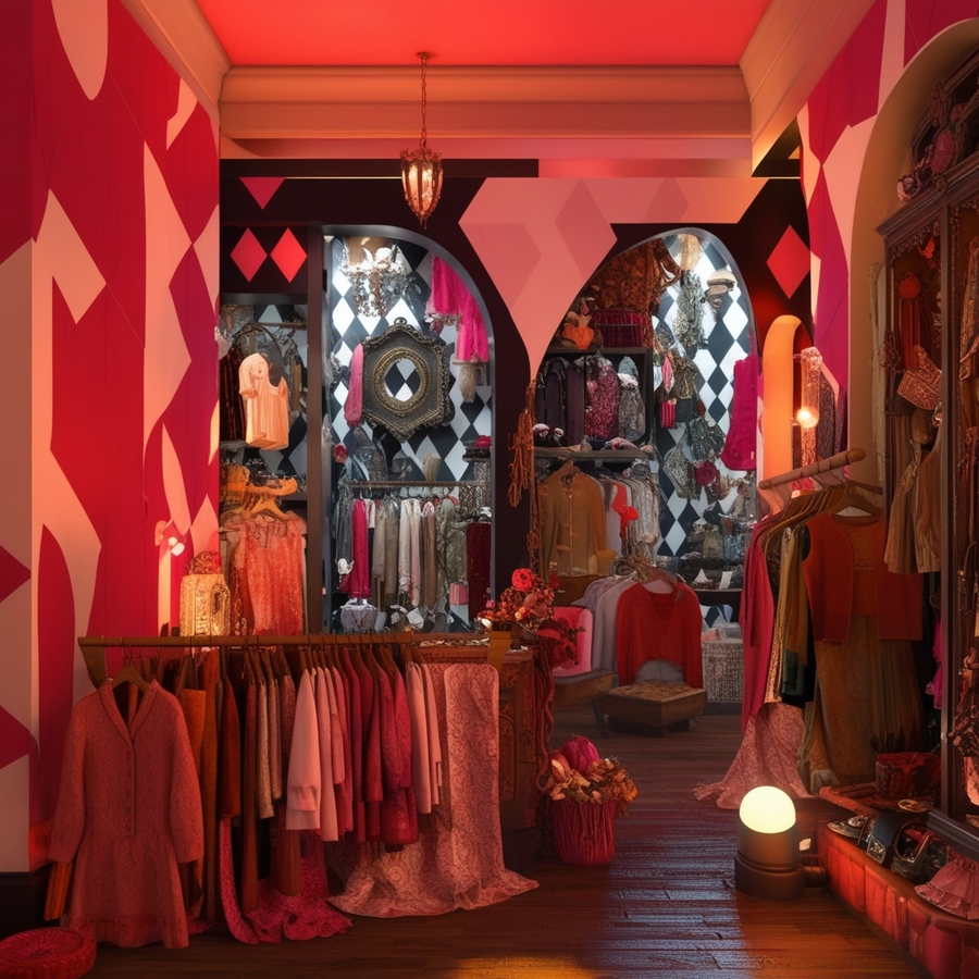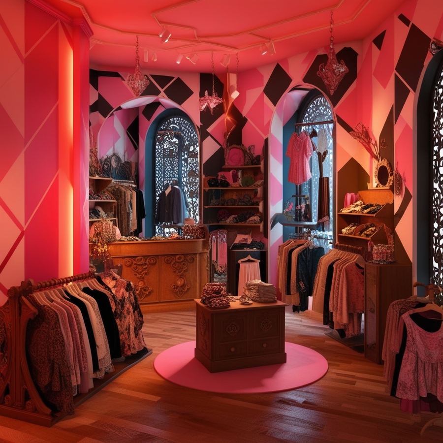 promt: create 3D octane model of clothes second hand shop with pink, white, and black wallpaper