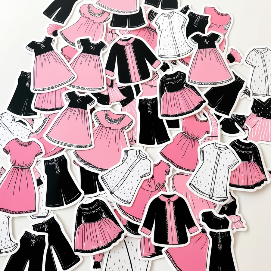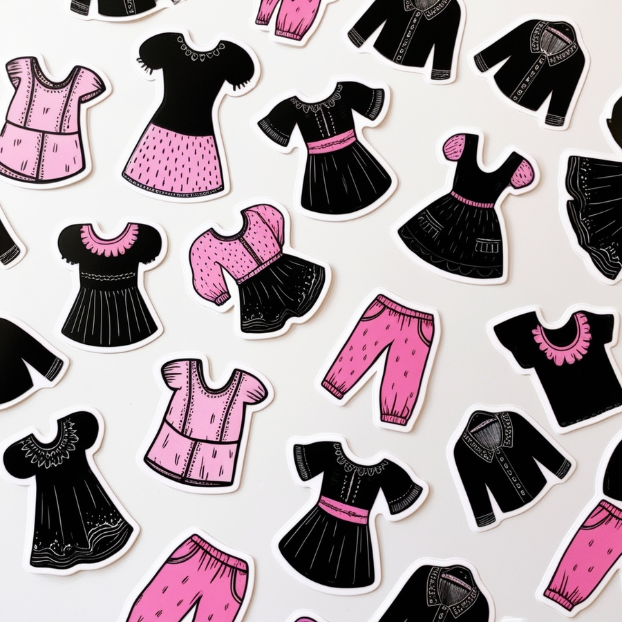 promt: black, pink and white stickers with illlustrations of clothes