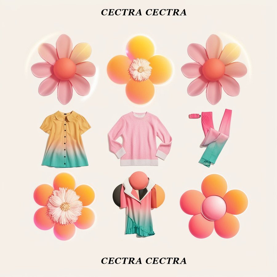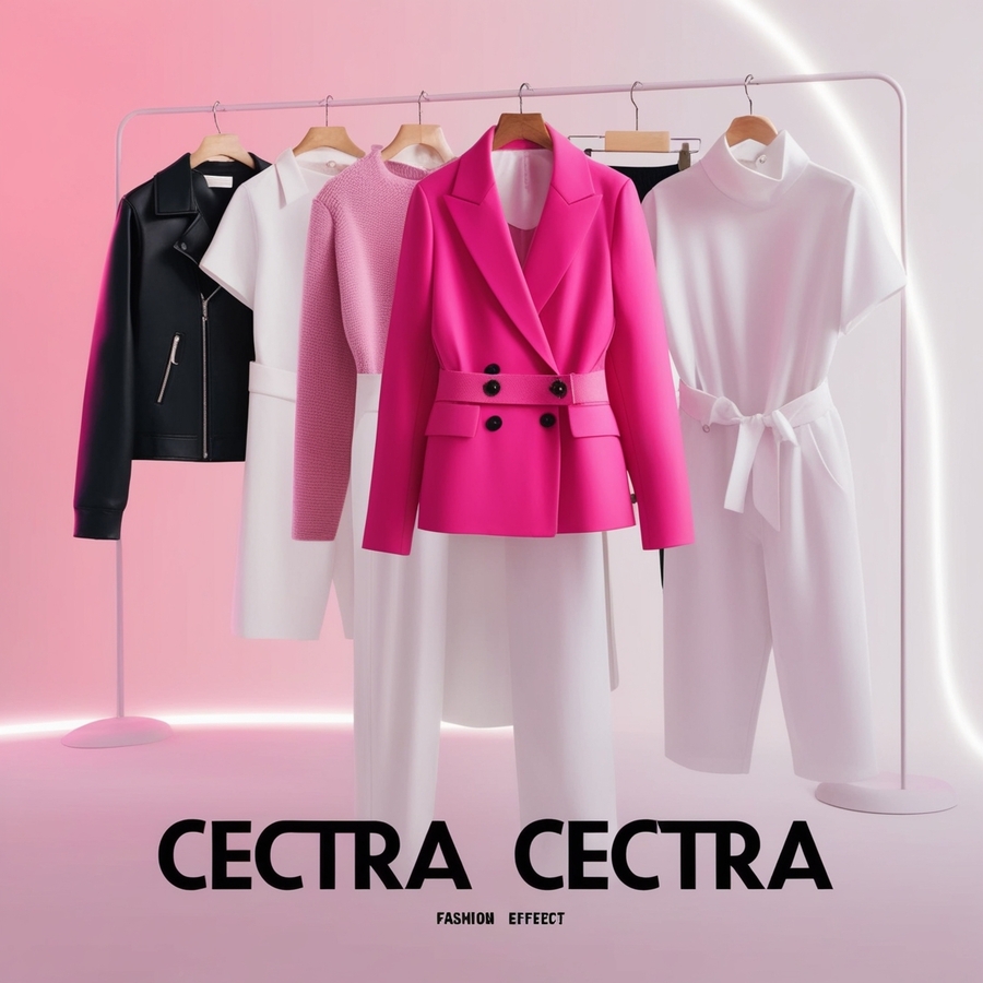 poster for brand with text «CECTRA CECTRA» on bottom, pink and black letters on white background, picture of clothes, pink gradient, white glow effect, fashion style, high resolution, detailed high quality illustration, bright color, soft lightning --ar 1140:1600