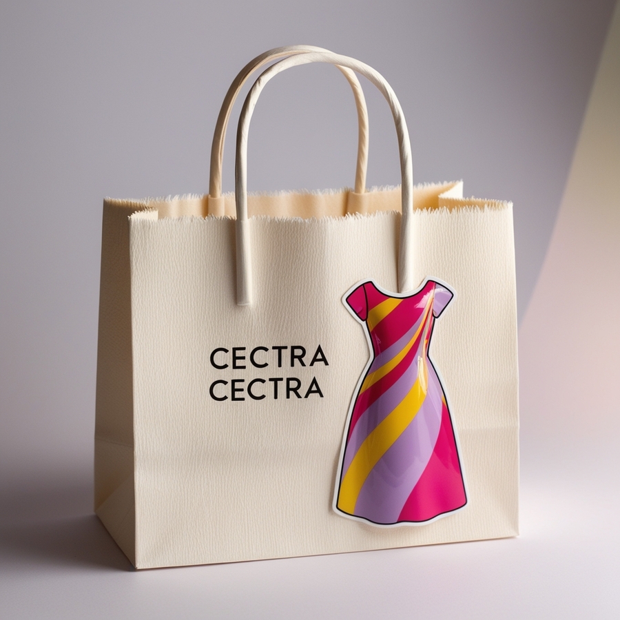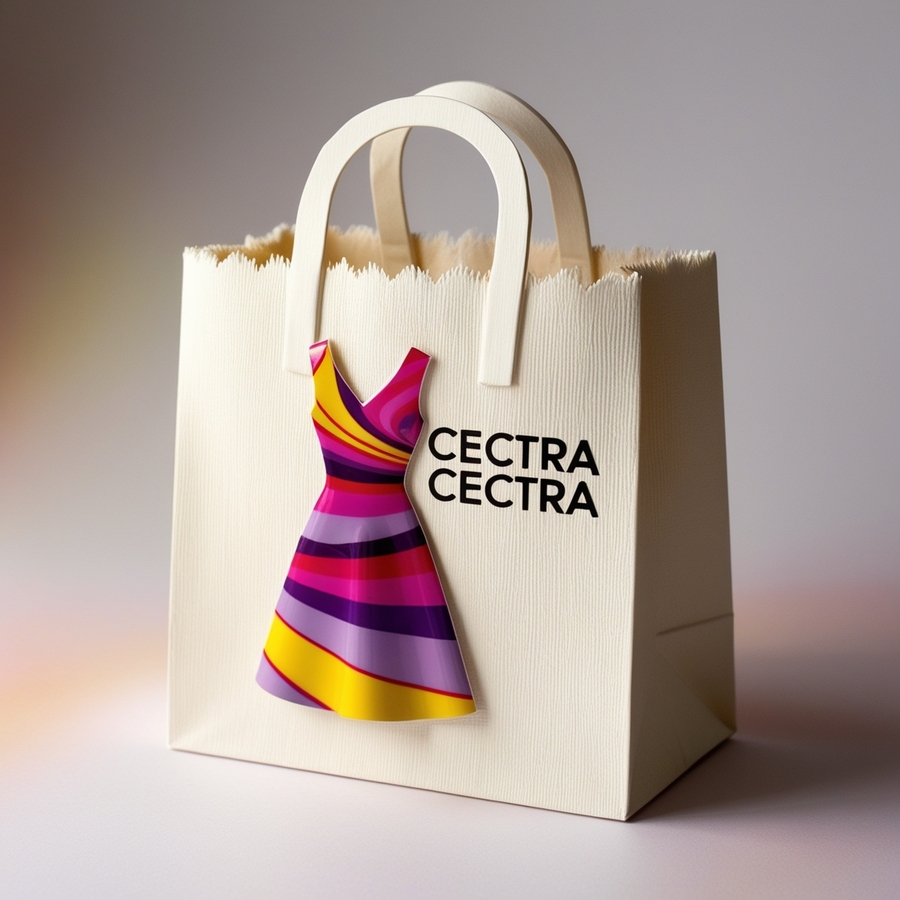 a paper craft pink bag with handles, with a dress sticker on the bag and the inscription CECTRA CECTRA with black letters