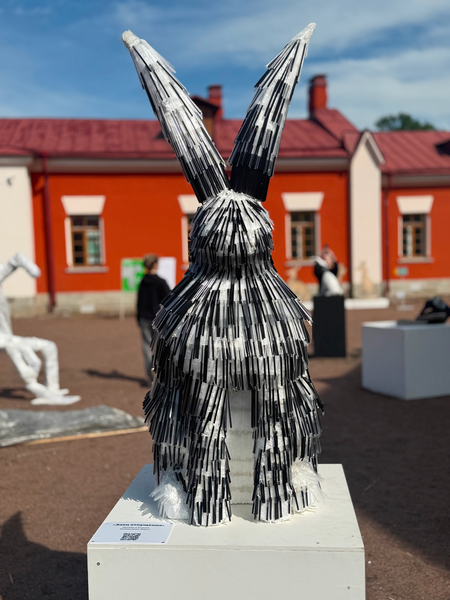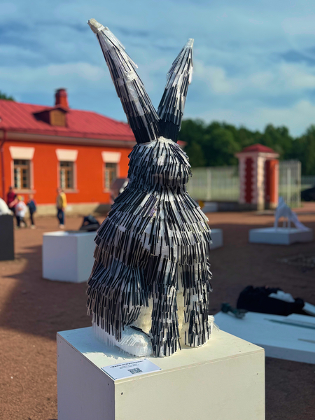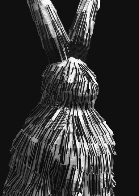 «Заяц отпущения» — это метаморфозное существо, в котором сливаются символы уязвимости и вины. Он не совсем заяц, не совсем козёл: его облик колеблется между образами. Этот гибрид стал носителем чужих страхов, чужой вины, чужого смысла. Тело покрыто прозрачными трубочками — материалом временным, массовым, перерабатываемым. Оно будто защищено, но на деле пустотно и хрупко. Это существо не защищается, а показывает, каково быть в центре чужих проекций. Оно не виновато, но наказано.
