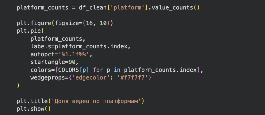 В процессе анализа были использованы следующие типы визуализации данных: круговая диаграмма — для отображения распределения видео между платформами и понимания структуры датасета, диаграмма рассеяния — для анализа связи между количеством просмотров и реакциями пользователей, столбчатая диаграмма — для сравнения среднего уровня вовлечённости аудитории и различий между платформами и категориями контента.