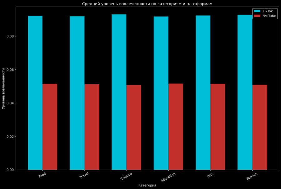 График показывает, что различия во вовлечённости сохраняются внутри категорий контента. Это позволяет сделать вывод, что платформа влияет на вовлечённость аудитории независимо от тематики видео, а не только за счёт типа контента.