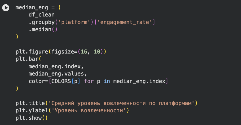 График позволяет оценить структуру данных и убедиться, что обе платформы представлены в сопоставимых объёмах. Это важно для корректности дальнейшего сравнения вовлечённости, так как анализ проводится на достаточно репрезентативной выборке.