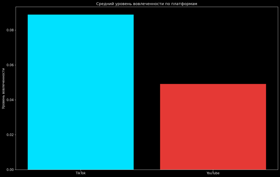 График наглядно показывает, что средний уровень вовлечённости аудитории на TikTok выше, чем на YouTube Shorts. Это даёт первичное подтверждение гипотезы о различиях в реакции пользователей на короткие видео в зависимости от платформы.
