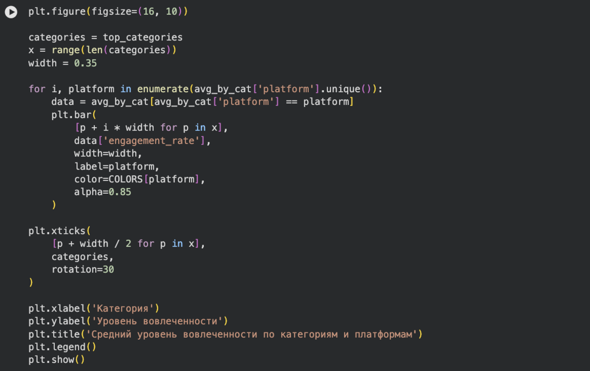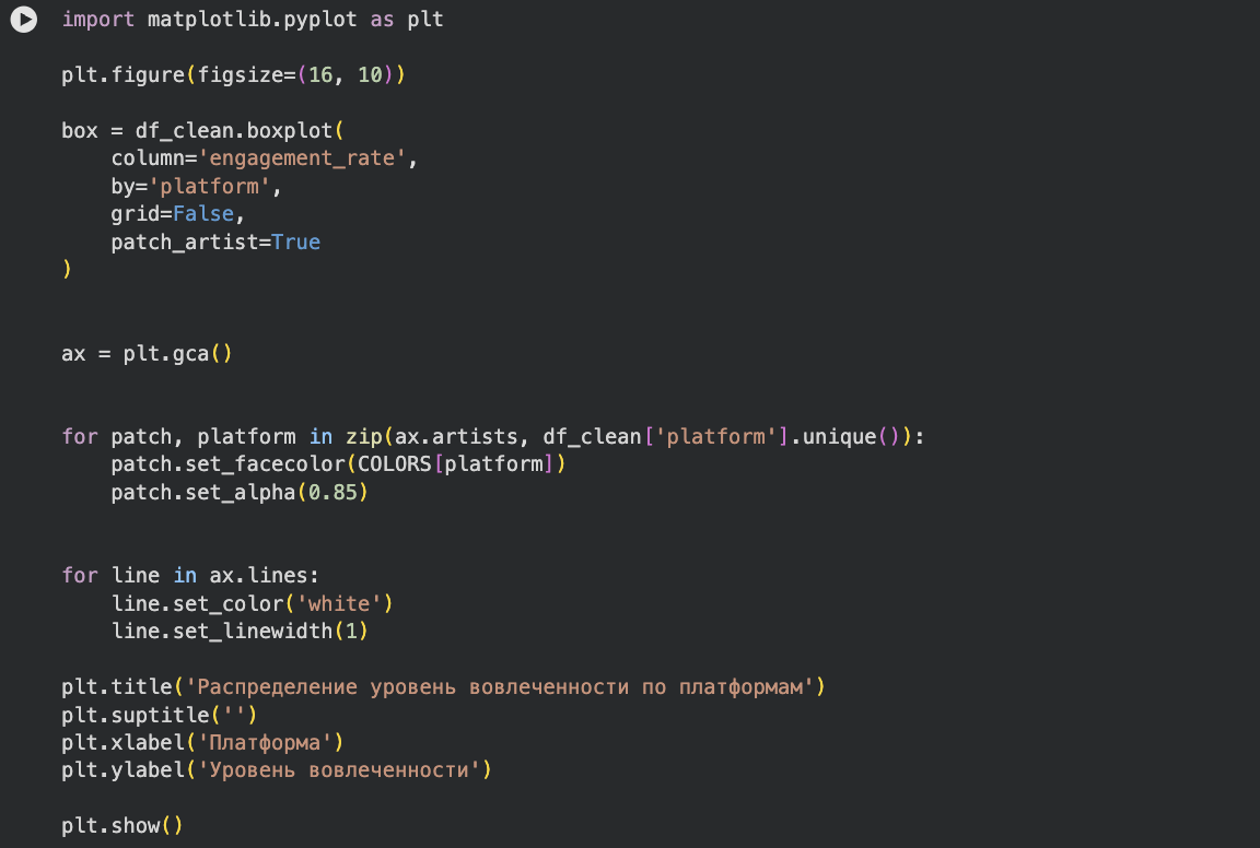 График позволяет увидеть не только средние значения, но и разброс вовлечённости. Он показывает, что на TikTok вовлечённость не только выше в среднем, но и более вариативна, тогда как на YouTube Shorts значения более сжаты. Это указывает на различия в характере взаимодействия аудитории с контентом.