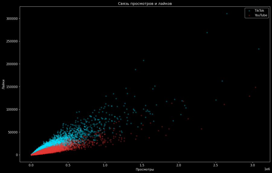 График показывает, как растёт реакция аудитории при увеличении охвата. Можно заметить, что при схожем количестве просмотров видео на TikTok чаще получают больше лайков, чем на YouTube Shorts. Это указывает на различия в паттернах вовлечённости и активности пользователей.
