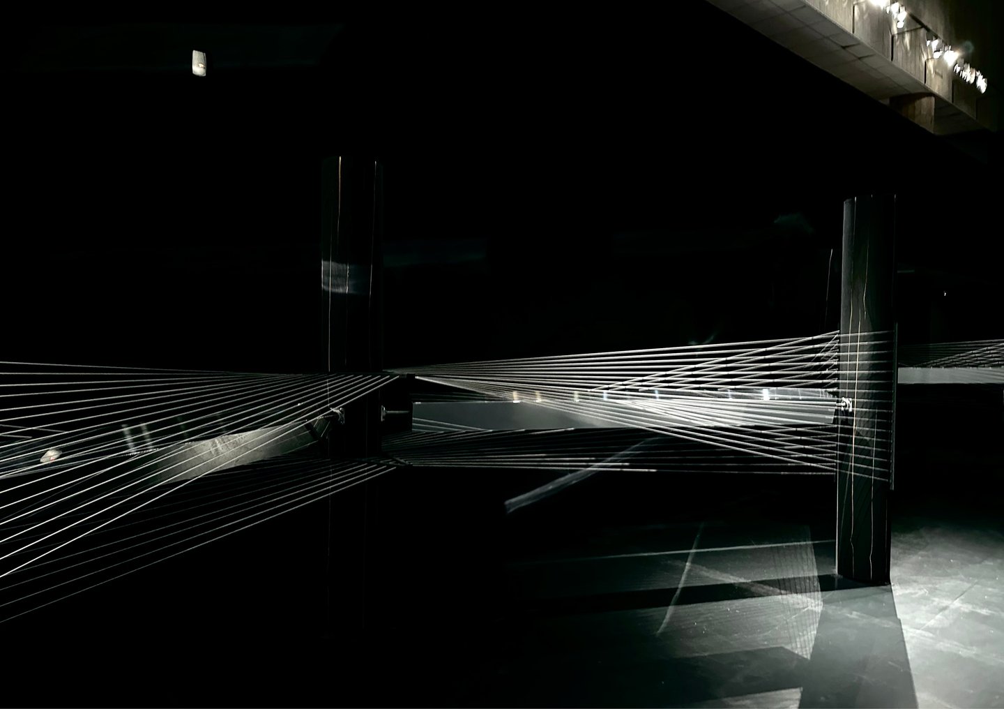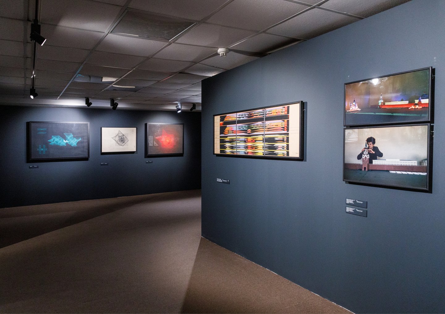 В выкрашенных в черный цвет залах на первом этаже, за зоной с «артефактами» сконцентрированы ранние поиски художника в живописи и графике. Завораживающие кинетические объекты, документальные фотографии формата «backstage» и видеорепортаж продолжают нарратив. Здесь находятся интерактивная инсталляция «След Большой Медведицы» (2024) и еще одна инсталляция, ранее не воссоздававшаяся: «Фотографическое пространство моей комнаты» (1985).