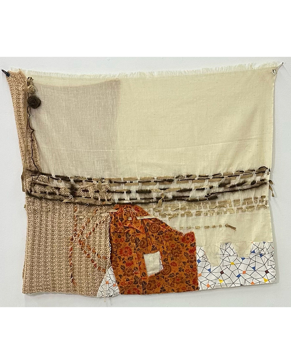 Льняное полотно, вязаный шарф мамы, штора, халат бабушки, пряжа из шерсти мой собаки, брюки супруга. 76×86 см, 2024