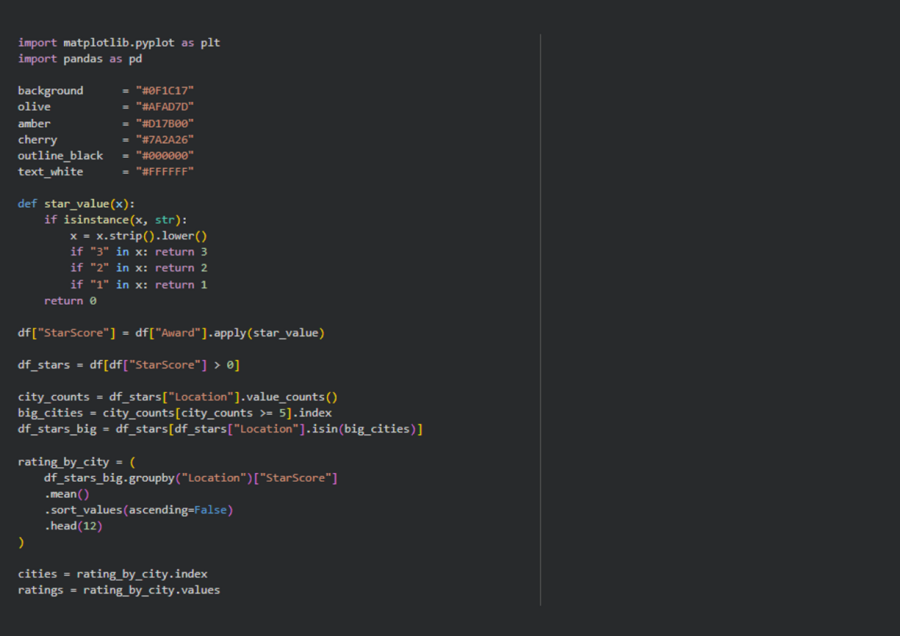 6. Анализ средних значений — реализован при расчёте среднего уровня Michelin-звёзд по городам. Это позволило перейти от анализа абсолютных показателей к оценке типичного уровня ресторанного рейтинга.