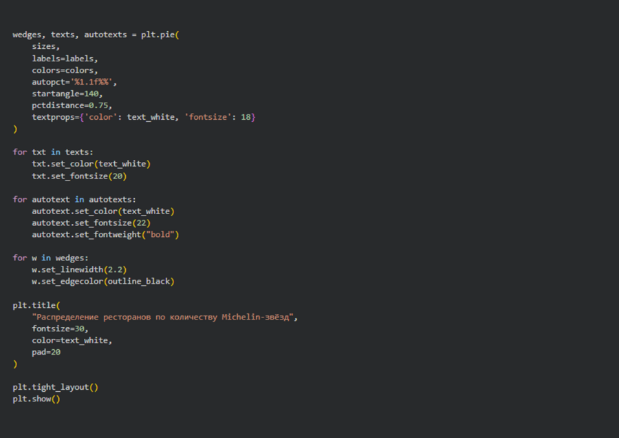 2. Структурный анализ — реализован с помощью круговой диаграммы, что позволило наглядно представить доли ресторанов с различным количеством Michelin-звёзд и выявить доминирующие категории.