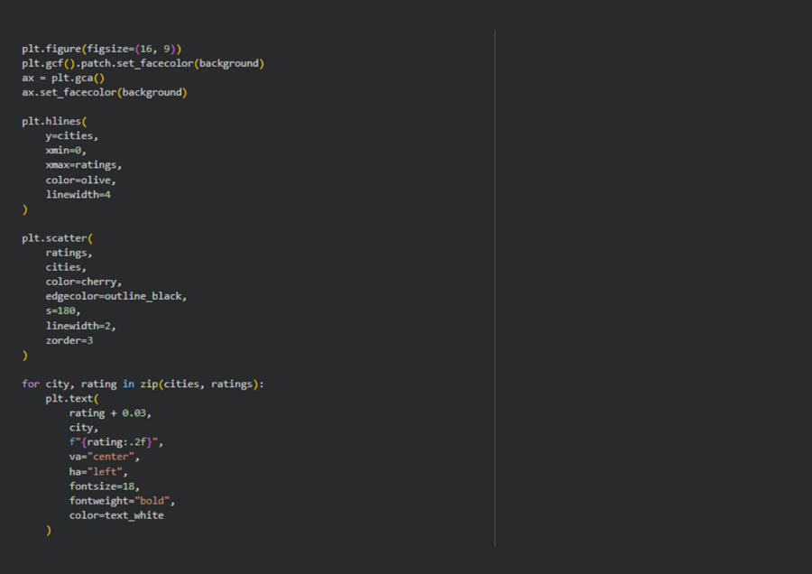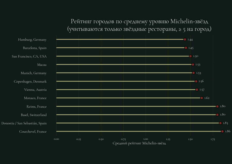 7. Визуальный анализ ранговых различий — выполнен с использованием lollipop-диаграммы, что обеспечило наглядное сравнение городов по среднему рейтингу Michelin-звёзд.