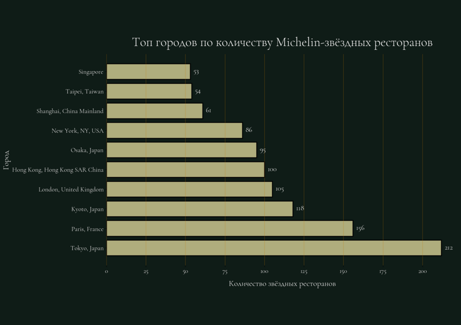 4. Сравнительный анализ территориальных единиц — выполнен с помощью горизонтальной столбчатой диаграммы, что позволило сопоставить города по общему числу полученных Michelin-звёзд.
