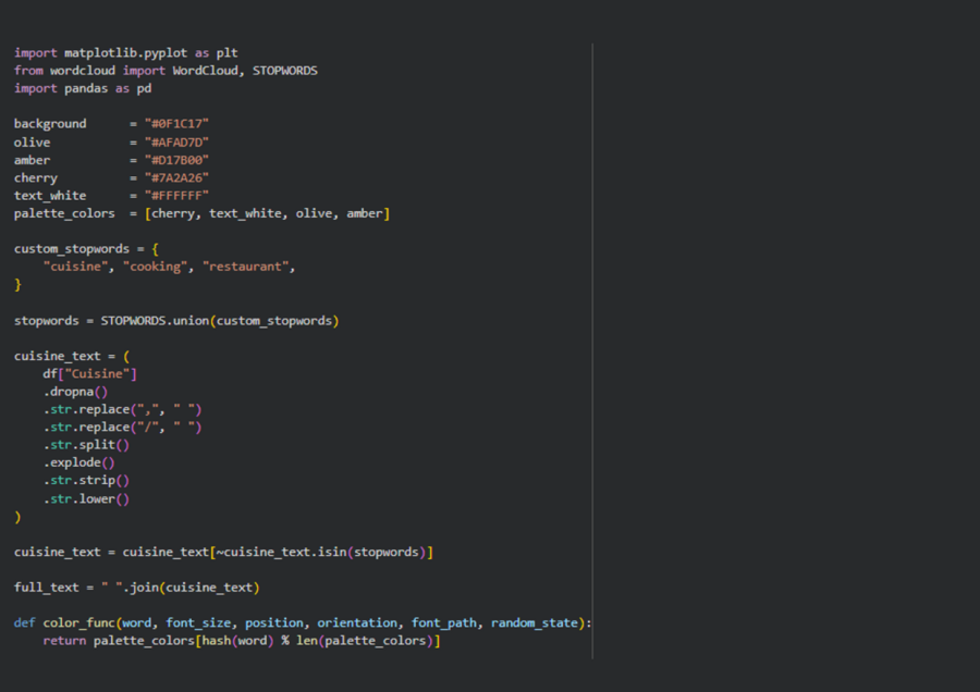 3. Библиотеки Python pandas — применялась для загрузки, очистки и анализа табличных данных, а также для агрегации показателей по ресторанам, городам и категориям. matplotlib — основной инструмент визуализации, использовался для построения круговых диаграмм, столбчатых графиков, рейтингов и линейных визуализаций. numpy — применялась для работы с числовыми данными и расчёта вспомогательных величин при построении графиков. wordcloud — использовалась для создания облака слов, отражающего распределение типов кухонь ресторанов. kagglehub — использовалась для автоматической загрузки датасета с платформы Kaggle. matplotlib.font_manager — применялась для подключения и использования кастомных шрифтов в визуализациях. kagglehub — для автоматического скачивания датасета matplotlib.font_manager — для подключения кастомного шрифта