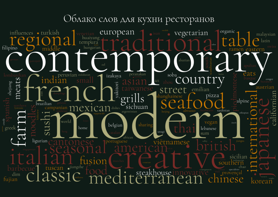 В завершение я использовала облако слов для анализа типов кухонь, представленных в ресторанах с Michelin-звездами. Наиболее часто встречающиеся слова включают «современную», «французскую» и «итальянскую» кухни, что свидетельствует о долгосрочном доминировании этих традиционных направлений. Вместе с тем, облако слов также отражает появление новых гастрономических трендов, таких как «креативная» кухня, что указывает на изменение кулинарных предпочтений.