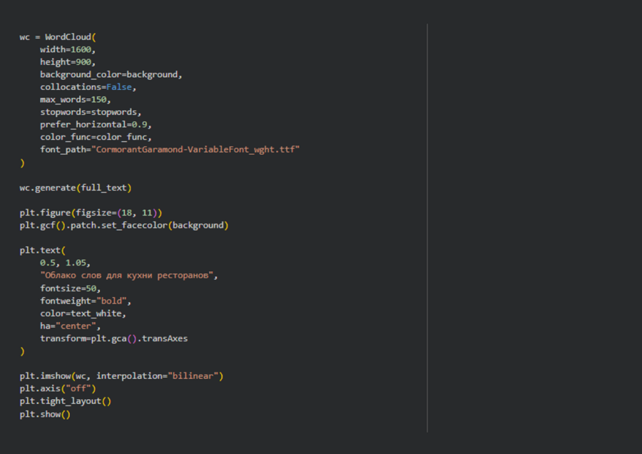 8. Текстовый анализ (Text Mining) — применялся для обработки описаний кухонь ресторанов. Токенизация, очистка текста от стоп-слов и нормализация регистра позволили выделить ключевые термины, характеризующие типы кухонь.