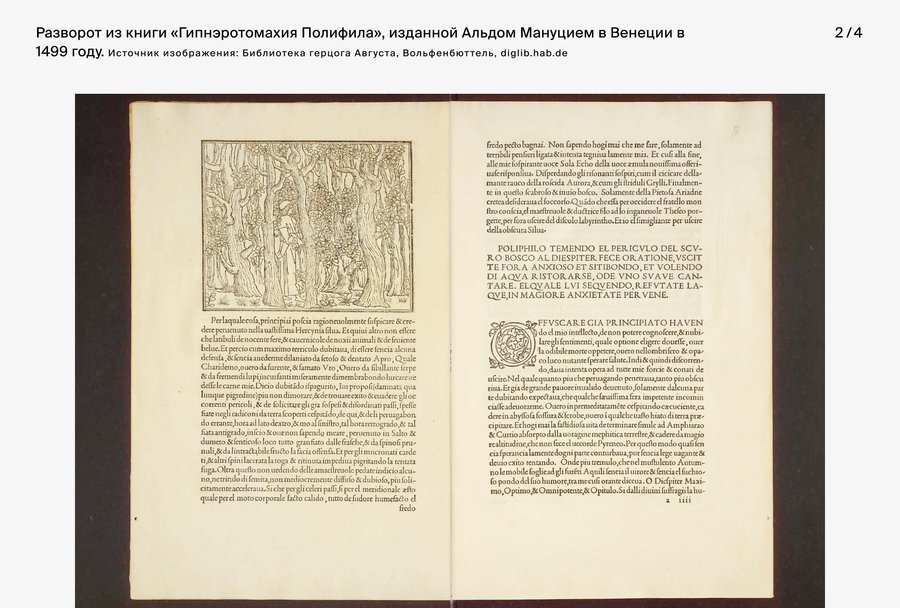 Возрождение — первый важный для нас этап развития типографики. Книги ренесанса образец лаконизма, точных пропорций, рациональной логики и тонкого вкуса. В это время создаются новые книжные шрифты — антиквы, значительно более удобочитаемые, чем предшествующие им готические
