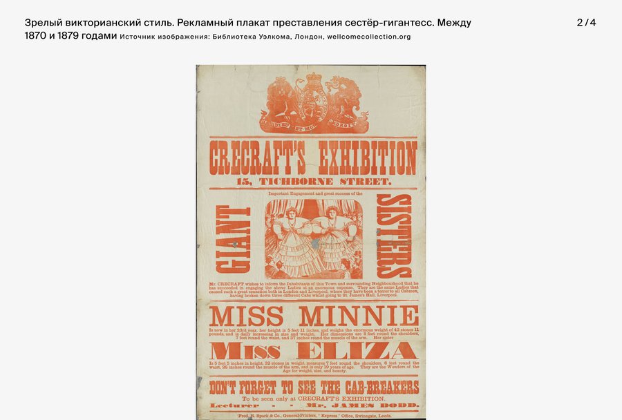 Викторианская типографика формировалась под воздействием бурно развивающейся тогда рекламы. В макетах максимум контраста, а в шрифтах невиданное до этого разнообразие. Начинается активное использование жирных начертаний антквы, гротесков, брусковых шрифтов, скриптов, а также возвращение декоративным элементам или, например, готике