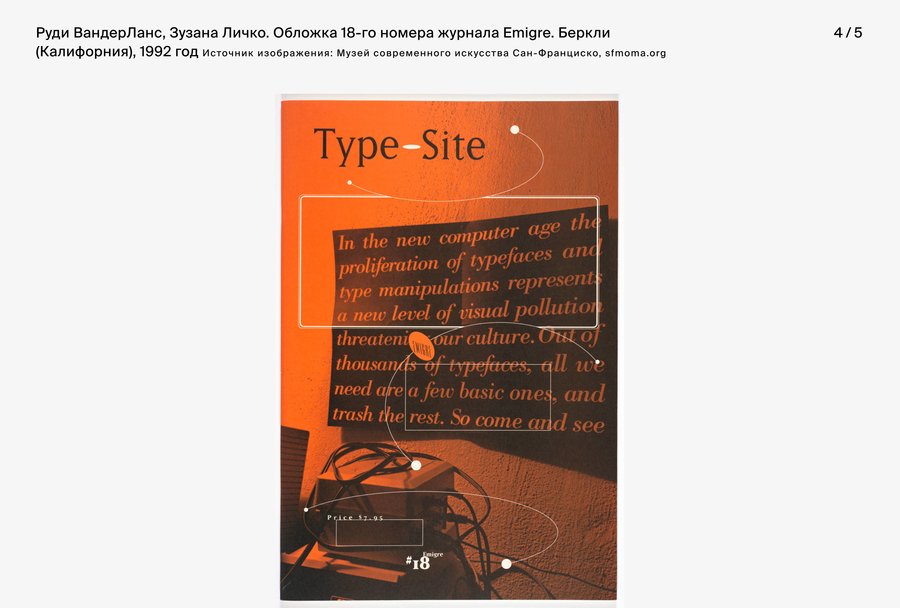 В типографике постмодернизм ещё и совпадает с распространением компьютерной вёрстки и цифровых шрифтов, что значительно расширило творческие возможности. Композиции в это время имеют децентрализованный, антииерархический характер, в использовании шрифтов — контрастные сочетания и иногда полное разрушение структуры набора