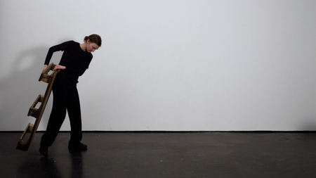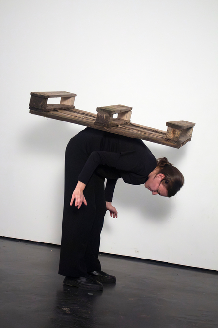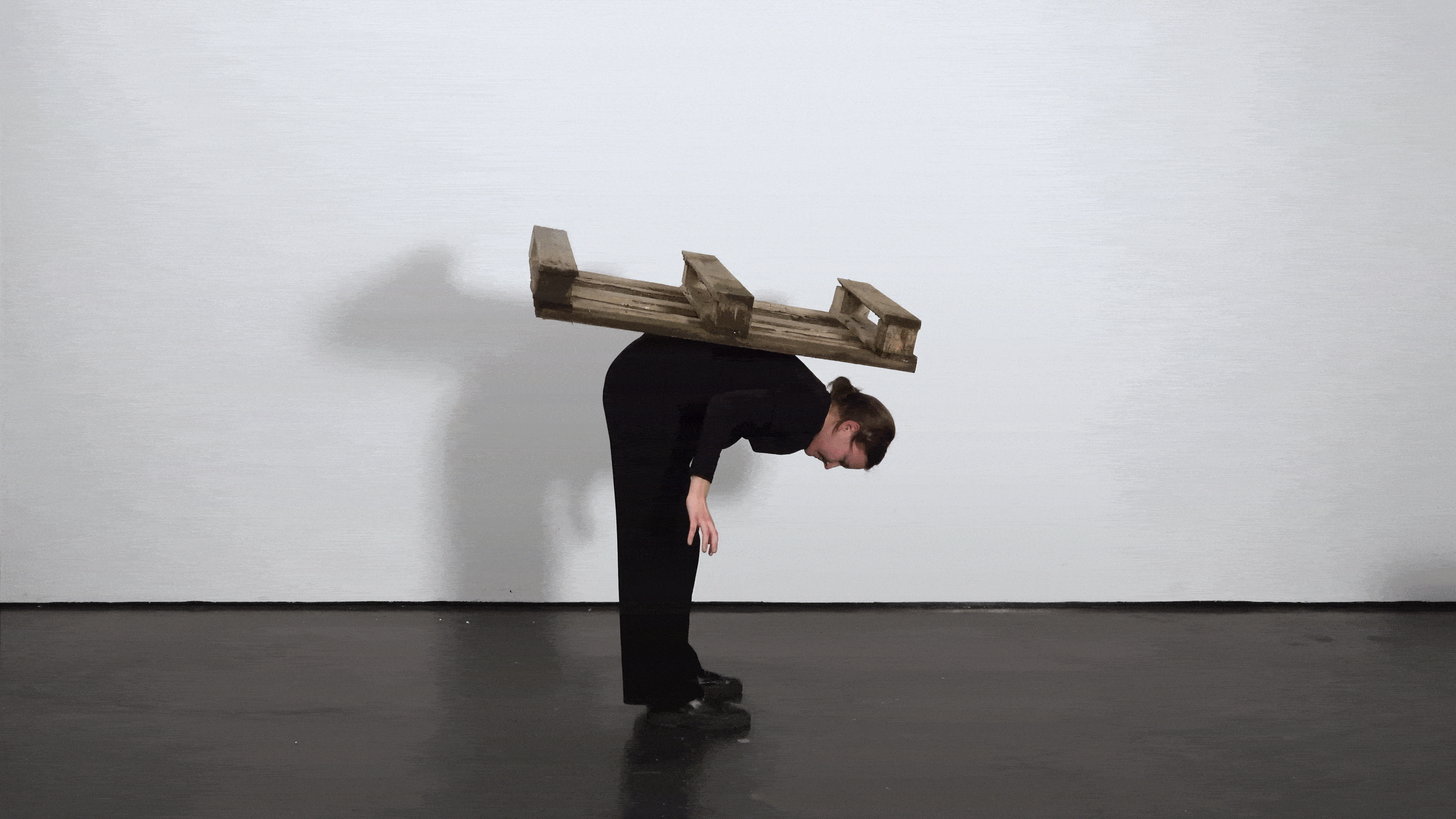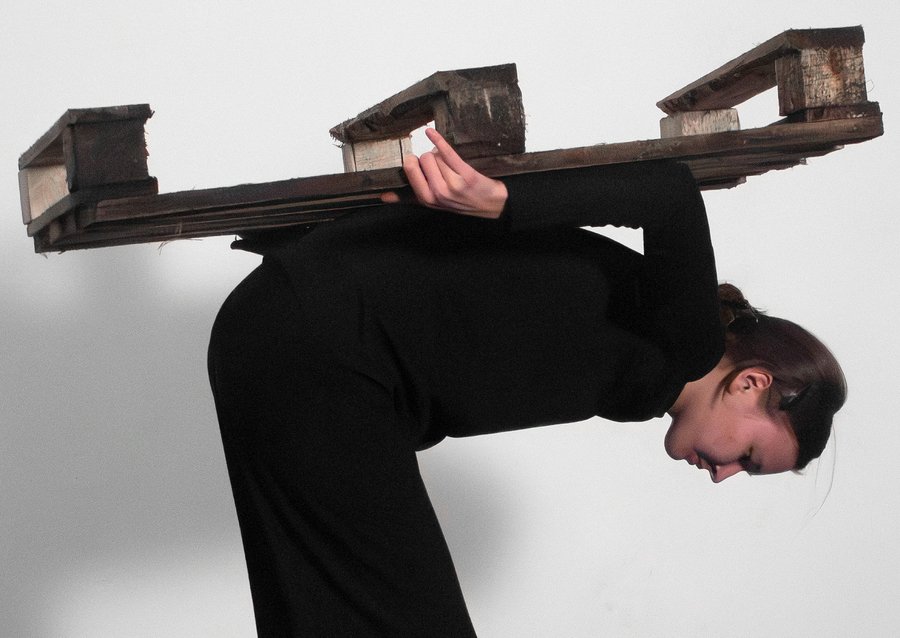 С детства я помню вес школьного рюкзака и попытку завязать шнурки, которая оканчивалась тем, что он перевешивал и я падала вперед. Здесь я работаю с этой же идеей баланса: удерживаю поддон на спине, пока не потеряю равновесие.