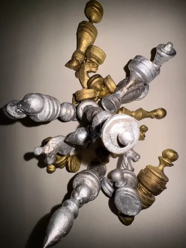 Золотистое и серебристое состаренное покрытие отражает утраченную святость, прежний благой порядок, иерархию. Что остаётся от мира, когда падут его фундаментальные оппозиции?