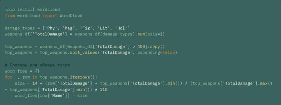 Из предыдущих диаграмм было выведено, что наиболее сильное оружие в игре, в общем, имеет значение урона, превышающее 400 единиц. Облако тегов позволяет визуализировать наименования этого оружия.