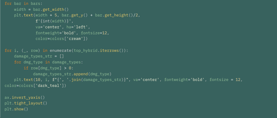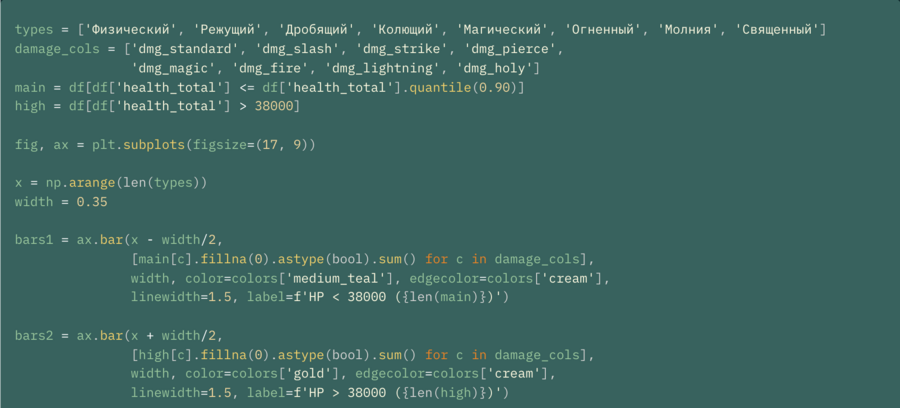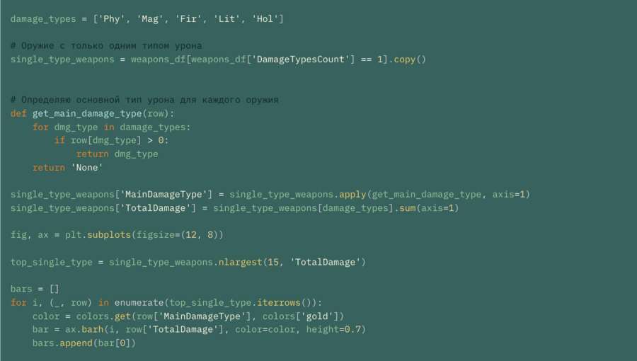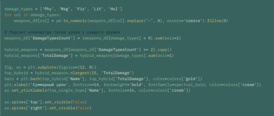 Все оружие было разделено на две группы: исключительно физические атаки и гибридные, использующие два и более вида урона. Затем данные были отсортированы по общему количеству урона, после чего 15 наименований с самыми высокими показателями были выведены в диаграммы.
