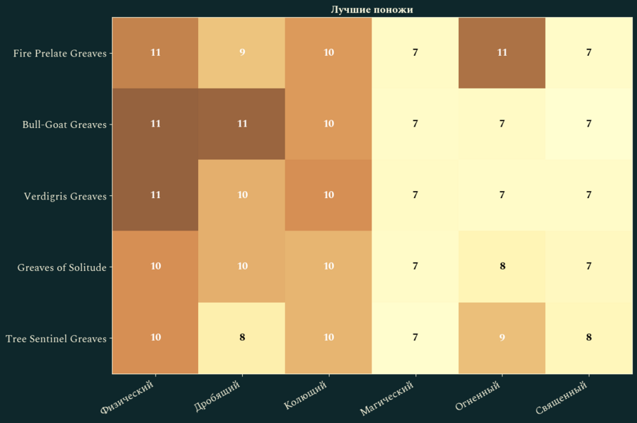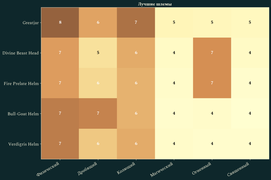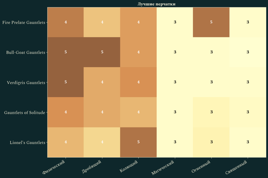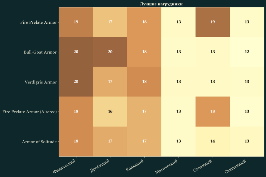 Перед созданием диаграмм все элементы брони были отсортированы по общему значению защиты и отобрала 5 лучших в каждой из четырех категорий: шлемы, нагрудники, перчатки и поножи. Так, диаграммы отражают значения защиты лучших частей доспехов в игре.