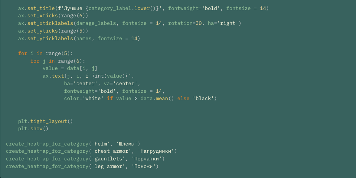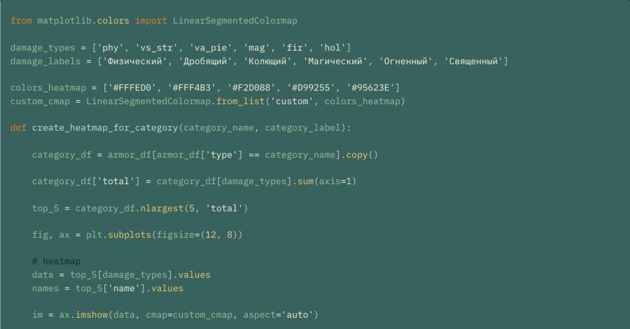 Для анализа эффективности элементов брони против различных типов урона была выбрана тепловая карта, ясно отображающая три ключевых измерения: тип брони, тип урона и эффективность защиты. Такой тип диаграммы также упрощает поиск универсальных и специализированных доспехов.