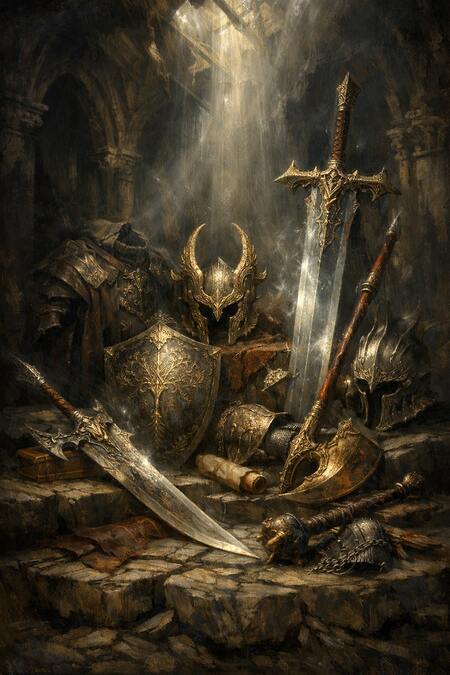 ChatGPT — генерация обложки и изображения-паттерна. Промпт обложки: A still-life composition of legendary weapons and ornate armor from Elden Ring arranged on cracked stone slabs inside a ruined cathedral. Ghostly light emanates from the artifacts, illuminating engraved details. Tall arches fade into shadow, dust in the air, shafts of light breaking through collapsed ceilings. Rich painterly strokes, dramatic chiaroscuro, dark fantasy oil painting, highly detailed yet atmospheric. Промпт паттерна: An abstract dark-fantasy pattern inspired by Elden Ring, featuring interwoven arcane circles, fractured sigils, and ancient runic geometry. Subtle concentric rings, branching golden lines, and weathered ornamental motifs emerge from a deep textured background. The composition is calm and symmetrical, designed as a refined backdrop rather than a focal illustration. Color palette strictly limited to deep teal 0E272B, muted teal 38625E, gold F2D06B, light gray BCCABD, and cream FEFAE1. Soft glow on gold elements, matte textured surfaces elsewhere. Painterly yet minimal, hand-painted oil texture, restrained contrast, museum-like elegance, academic tone. No characters, no text, no symbols that read as letters. High resolution, seamless or lightly vignetted edges, suitable for presentation slides. Dark fantasy ornamentation with subtle sacred geometry.