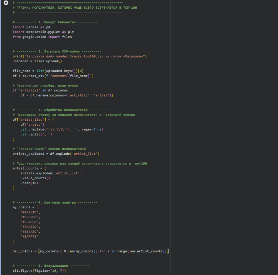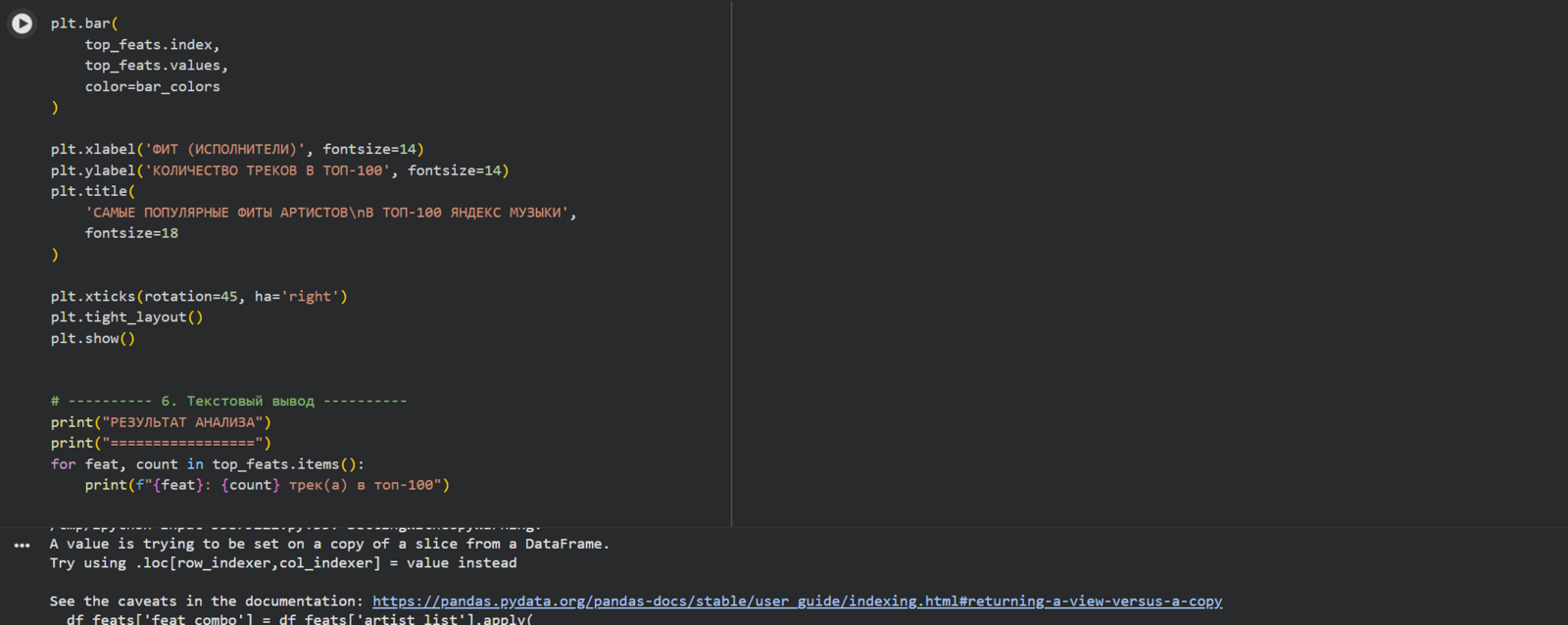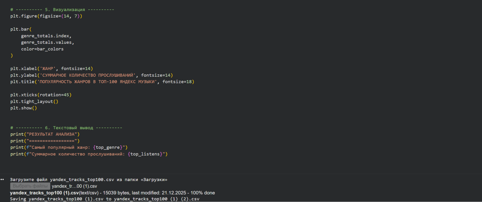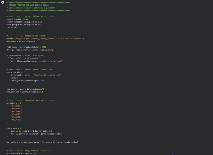 Таким образом, эта таблица помогает понять, какую музыку чаще всего слушают пользователи Яндекс Музыки. По жанрам и количеству прослушиваний видно, какие направления сейчас наиболее популярны, а какие интересуют более узкую аудиторию. Анализ этих данных позволяет увидеть общие музыкальные предпочтения слушателей и сделать выводы о том, какие жанры доминируют в чартах сервиса