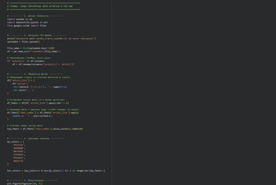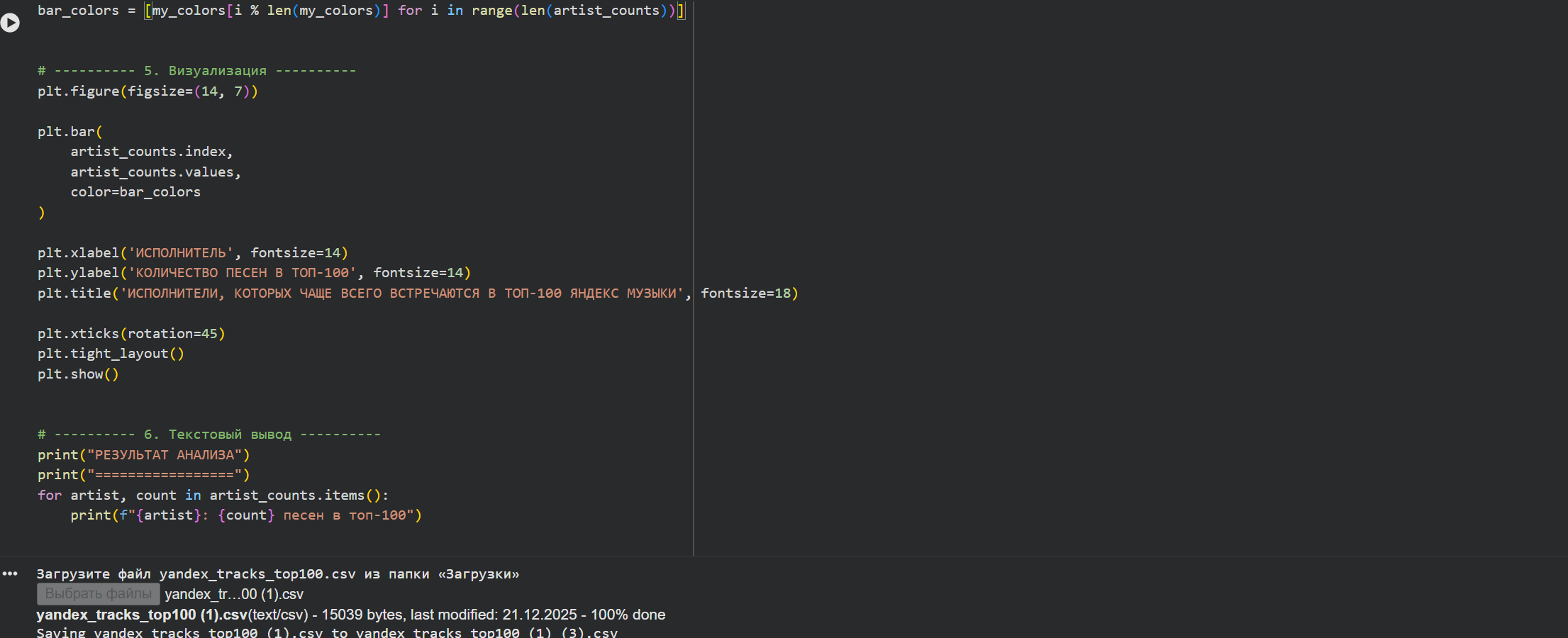 Для анализа и визуализации данных был выбран датасет с информацией о топ-100 популярных треках в Яндекс Музыке, найденный на платформе Kaggle. Данные оказались хорошо структурированными, без пропусков и с понятными показателями, поэтому их удобно использовать для анализа и поиска закономерностей