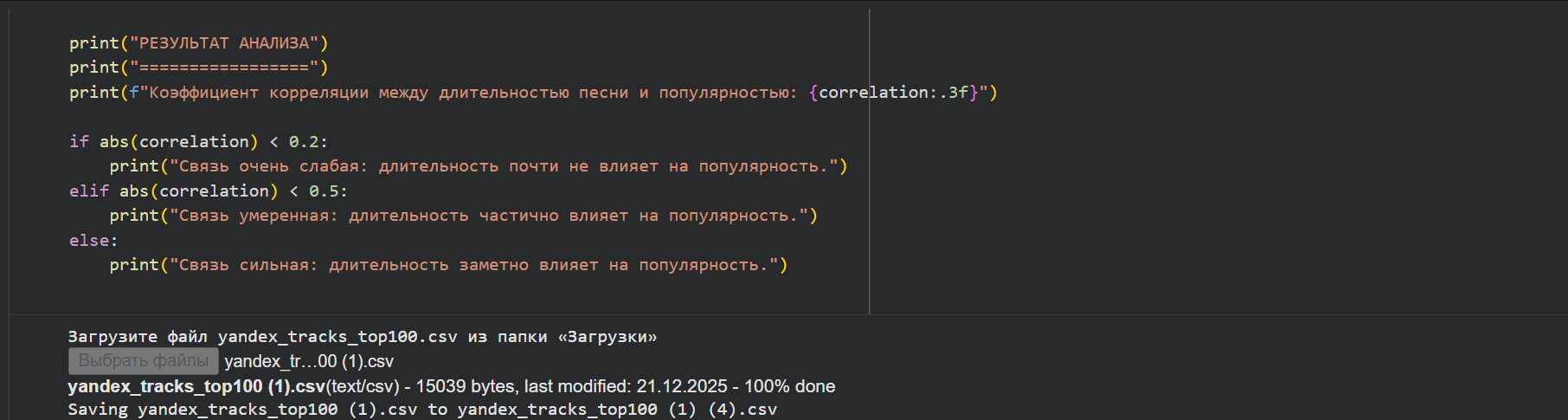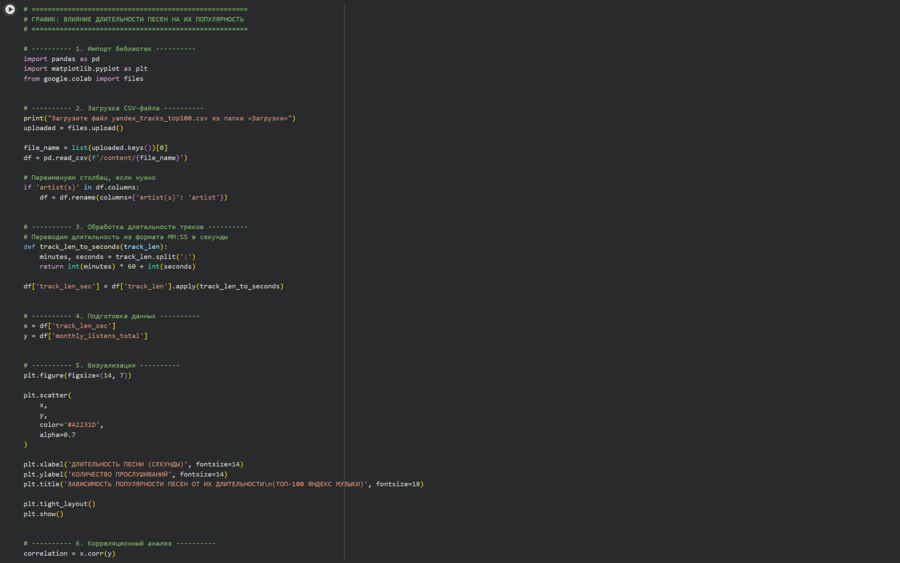 Музыкальные данные интересны тем, что они отражают вкусы и поведение слушателей. Анализ таких данных помогает понять, какие жанры и исполнители наиболее популярны, а также как различные характеристики треков -например, длительность или наличие explicit-контента -связаны с количеством прослушиваний и лайков. Эти выводы могут быть полезны для продвижения музыкального контента и принятия решений в рамках сервиса