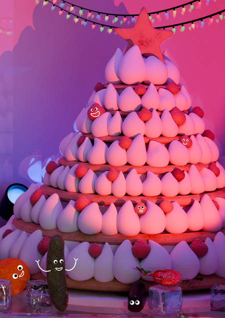 Это мини-сцена, где новогодний корпоратив устраивают сами продукты — прямо внутри огромного холодильника. Полки превращаются в танцполы, барные зоны и места для тостов. Бутылки и банки становятся декорациями, на льду висят гирлянды и маленькие праздничные аксессуары.