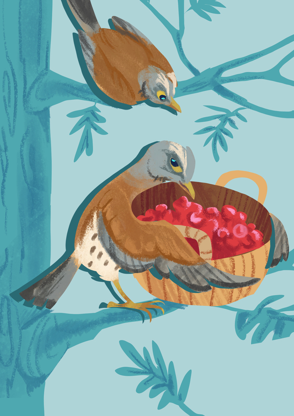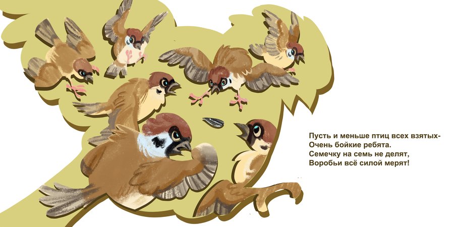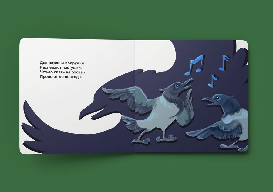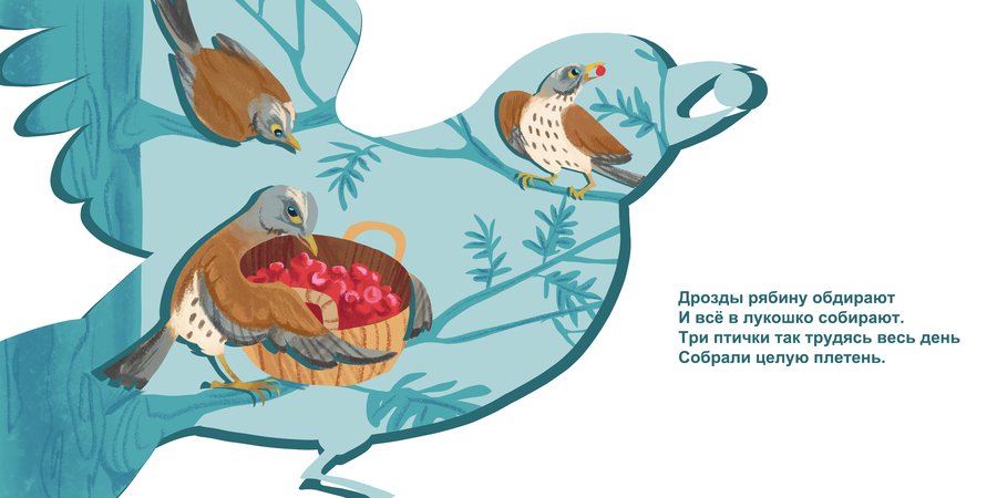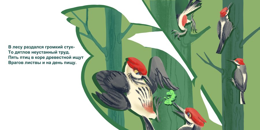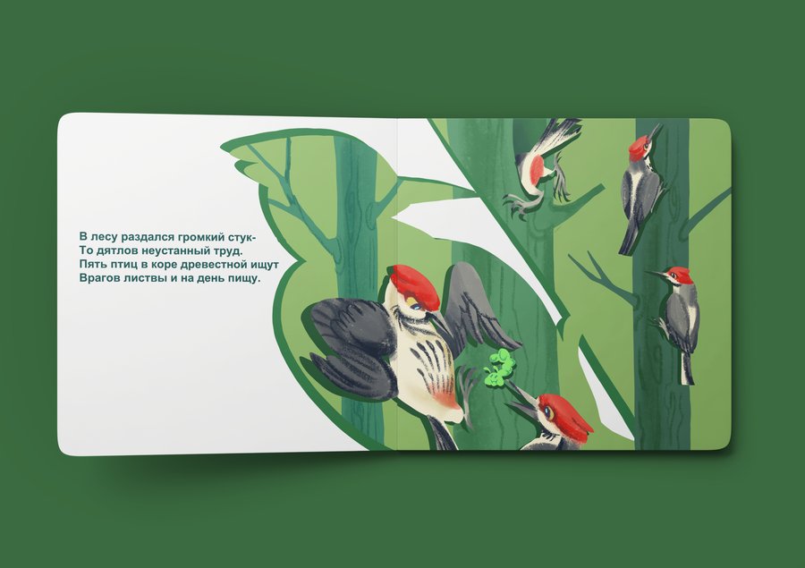 Книжка-картонка изображающая птиц средней полосы, которых можно встретить в лесу. Ребёнку предлагается найти всех птиц на картинке и посчитать их, с каждым разворотом количество птиц увеличивается. Цель книжки — показать птиц, которые обитают рядом с нами.